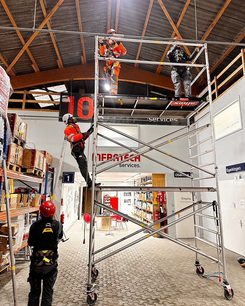 - Einrichten von temporären Seil-, Sicherungs- und Zugangssystemen an Dächern und Konstruktionen sowie für das Besteigen von mobilen Leitern